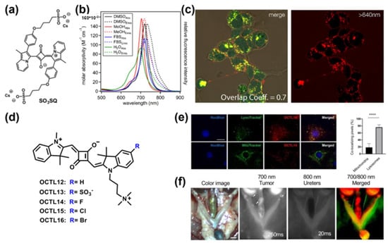 Recently, Choi et al. also developed a series of unsymmetrical SQ, i.e., OCTL12-16 (Figure 11d) []. The surface charges of SQs are suitable for rapid transporter-mediated cellular uptake. As shown in Figure 11e, OCTL14 showed excellent lysosome-targeting ability (76.2%), optimal optical and pharmacokinetic profiles due to the positive charge of the quaternary anime. Dual fluorescence imaging of tumors and ureters incubated with OCTL14 and ZW800-PEG showed high specificity and sensitivity after a single intravenous injection (Figure 11f).