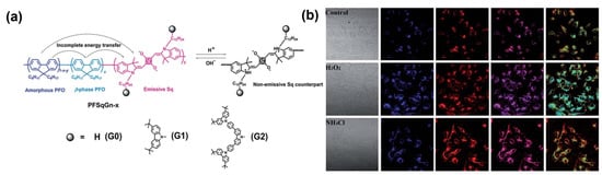 (a) Molecular structures of PFSqG0-2 polymers. (b) The fluorescent images of MCF-7 cells incubated with PFSqG2—5% and treated with NH4Cl and H2O2 in pH 7.4 PBS buffer solution using confocal microscopy upon laser illumination. Reprinted with permission from Ref. []. Copyright 2017, Royal Society of Chemistry.