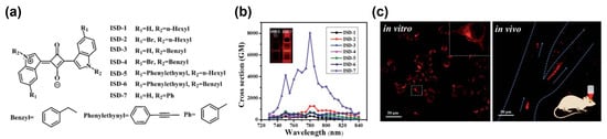 Up-conversion luminescence (UCL) is a special process whereby long wavelength photons are converted into shorter wavelength photons by efficient energy-transfer processes []. In two-photon absorption (TPA), one molecule absorbs two photons simultaneously when excited, and the two-photon fluorescence belongs to UCL, which shows good spatial selectivity and less damage to samples compared with those of the one-photon process []. SQs with high TPA cross-section (δ) value were successfully designed, including extended π-systems and various conjugated D/A units []. Zhang et al. reported a series of symmetrical SQs for TPA bioimaging, i.e., ISD-1-7 (Figure 13a) []. Among the series, ISD-7 had a remarkable TPA δ value above 8000 GM at 780 nm (Figure 13b), which is suitable for the optical window in biological tissue. Hence, ISD-7 was successfully employed in NIR fibroblast cell imaging and in vivo cerebrovascular blood fluid tracing (Figure 13c) using two-photon laser confocal scanning microscopy. Recently, Belfield and Hagan et al. also developed an unsymmetrical SQ with charged nonconjugated substituent [], offering bright red fluorescence two-photon imaging of HeLa cells.