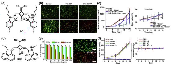 Recently, Wang et al. reported a new SQ (SQ1, Figure 14d) employing the same core but with 1,8-naphtholactam as the end group []. SQ1 was encapsulated with the amphiphilic polymer DSPE-PEG and the peptide CREKA to obtain NPs (SQ1 nanoprobe), showing excellent NIR-II fluorescence imaging and photoacoustic imaging. Figure 14e shows that SQ1 NPs can kill most MDA-MB-231 cells under NIR irradiation as a result of efficient photothermal effects, while most cells were alive in the control group. In addition, MDAMB-231 breast cancer tumor-bearing mice were used to study the photothermal therapeutic efficiency, indicating that the tumor growth of the SQ1 nanoprobe-treated group upon NIR irradiation was effectively suppressed when compared to other control groups (Figure 14f).