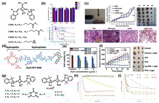 (a) Molecular structures of CSBE, CSME, CSBM, and CSTS. (b) Cell viability of different cancer cells after treatment with CSBE, CSME, CSBM, and CSTS (top). Viability of MCF-7 cells treated with different concentrations of CSBE, CSME, CSBM, and CSTS under laser irradiation (bottom). (c) The corresponding PDT results treated with CSBE. Reprinted with permission from Ref. []. Copyright 2017, Elsevier Ltd. (d) Molecular structure of ICy5-CPT-RGD. (e) Cell viability of BEL- 7402 cells treated with control group, ICy5, and PNT, with or without laser irradiation. (f) Tumor growth curves (left) and photographs of tumors (right) of tumor-bearing mice treated with PBS (control), control + light, CPT, PTN, Cy-PEG + light, and PTN + light. Reprinted with permission from Ref. []. Copyright 2018, Wiley-VCH. (g) Molecular structures of SQs 4–6, 8, 9 and 14 with different groups. (h) Photostability experiment of SQs 4–6, 8, 9 and 14 in DMSO. (i) Qualitative 1O2 generation ability test of SQs 4–6, 8, 9, 14 and MB in PBS solution. Adapted with permission from Ref. []. Copyright 2019, Elsevier Ltd.