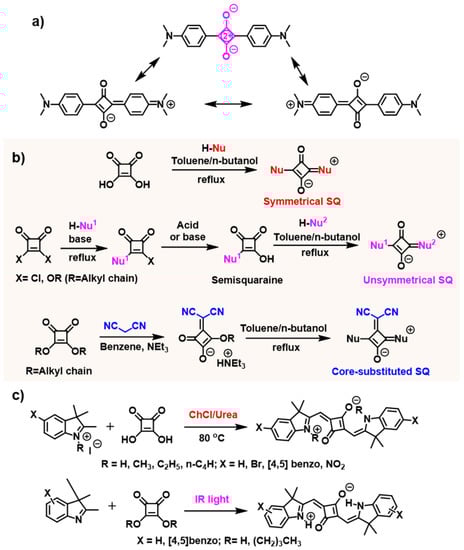 SQs can be simply divided into symmetrical SQs and unsymmetrical SQs, depending on whether the end-groups are the same. Their synthetic routes are shown in Scheme 1b [,]. As shown, the symmetrical SQ is simply synthesized by the condensation of one equivalent squaric acid with two equivalent nucleophiles in a mixture of high-boiling-point alcohol and aromatic hydrocarbons. Although the major product is the 1,3-substituted SQ, the 1,2-substituted by-product can also be observed []. Unlike symmetrical SQs, the synthesis of unsymmetrical SQs is less straightforward, and it usually involves three steps: (1) one equivalent nucleophile is used to react with squaryl dichloride or squaric acid ester to give a stable intermediate, (2) the intermediate is treated with base or acid to afford the semisquaraine, (3) the semisquaraine reacted with another equivalent nucleophile. However, combining different end-groups allows for a better tuning of the chemical and optical properties of unsymmetrical dyes. Moreover, the core-substituted SQs mean that one oxygen atom of the central square ring is replaced by other groups (Scheme 1b), among which the dicyanomethylene group is the most efficient electron-withdrawing substituent to modify the molecular geometry, molecular crystallinity, and the optical properties [,]. Recently, scientists have also turned their attention to new synthetic approaches towards SQs. For example, Shankarling et al. developed a more environment-friendly approach to obtaining symmetrical SQs with enhanced yield by using choline chloride/urea mixtures as the biorenewable deep eutectic solvent (Scheme 1c) []. Furthermore, a solvent-free infrared radiation synthetic method has been reported by Punzi et al. for preparing indolenine-based SQs (Scheme 1c) [].