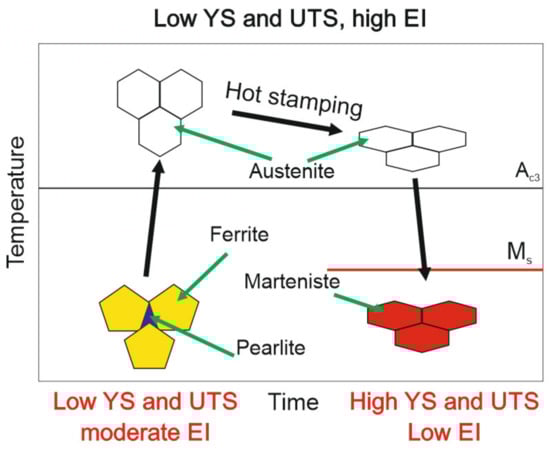 Evolution of microstructure and mechanical properties in the hot-stamping process; YS—yield strength, UTS—ultimate tensile strength, El-elongation.