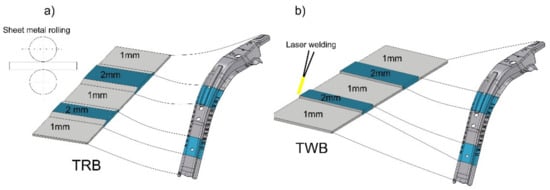 - Usage of steel sheets having different thickness to the production of the flat blanks joined together with use of laser welding (Figure 3b). Laser welding can be performed during production of the material, or directly by a manufacturer of the drawpieces. The flat blank produced in such a way is formed and quenched in process of the hot stamping. It is so called tailor welded blanks (TWB).