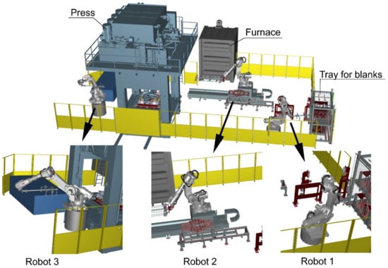 The hot stamping technology is a fully automated process. At the beginning, the flat blank is taken from a tray and is marked (robot 1). In the next step, the blank is transferred to a furnace, and after heating-up the blank is transported to the stamping die in the press (robot 2). The process is completed by taking the ready drawpiece from the stamping die and moving it to conveyer (robot 3), the same as shown in Figure 5. During the development of automated lines to the hot stamping process, in the first succession, a so-called digital twin of the line is developed. This constitutes a faithful representation of the automated manufacturing line in the form of a complex computer model [1].