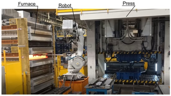 A digital twin of the hot stamping line (Figure 5) consists of: 3D CAD models of the most important components of the line like industrial robots, furnace, press, tool, running tracks, holding tables, conveyers, and auxiliary tooling. Models of PLC controllers are constructed as well, and control programs for driver elements of the complete line are written. Tecnomatix software produced by Siemens represents a digital environment for the elaboration of the digital twins of the automated hot stamping production lines [19]. The digital twin allows for the simulation and optimization of operational kinetics of the robots accomplishing production process, for analysis and minimization of time of production cycles, searching after weak operational points of the control systems, and for real time visualization of operation of the complete line. Based on the digital twin, the symmetric real production lines can be constructed. In Figure 6, a fragment of the real hot stamping line is shown, which is responsible for loading of the cold blank to a furnace and transporting heated blanks from the furnace to a stamping die in the press.