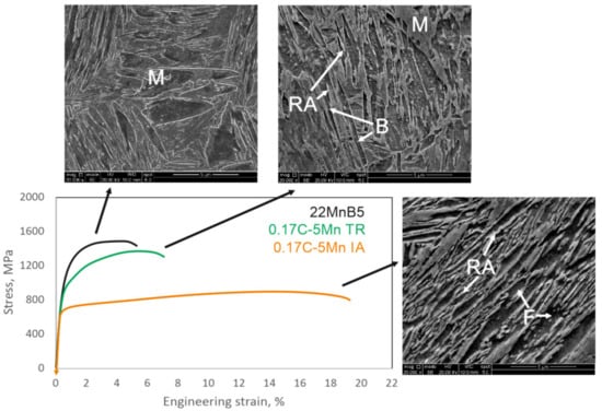 The tensile behavior and exemplary microstructures of typical martensitic 22MnB5 steel and two types of advanced steels are presented in Figure 7. The thermomechanically rolled 0.17C-5Mn TR steel with bainitic-martensitic microstructure and retained austenite (RA) shows strength properties similar to the 22MnB5 steel with better ductility. Such steel is suitable for intrusion resistance areas. The same steel but subjected to intercritical annealing treatment at 685 °C for 5 min shows a mixture of fine laths of ferrite and retained austenite. Such a microstructure provides much better ductility and energy absorption characteristics at lower strength properties. Therefore, such steels are designed for energy absorption areas.