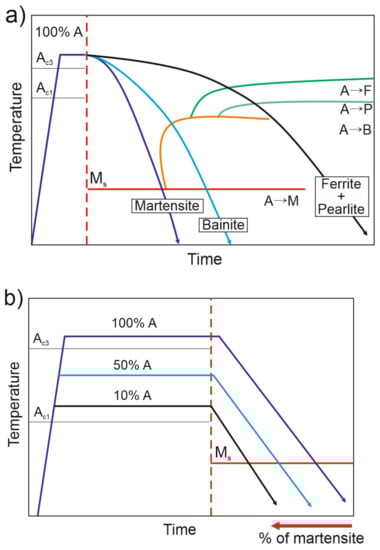 Curves of phase transformation are evaluated on the base of CCT diagrams [37]. In [19,38,39], the authors elaborated advanced material’s model comprising phase transformation and implemented it into a commercial FEM program [11].