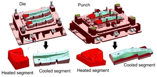 This is implemented nowadays in so called tailored heat treatment [31], which involves the usage of specially developed tool, i.e., stamping die, which incorporates heated segments (with cartridge heaters) in areas where a soft zone should be generated, and cooled segments (with water), where hard zones need to be generated (Figure 9). Martensitic transformation does not occur in the contact area of the formed drawpiece and heated segment of the tool, and lower values of mechanical parameters are obtained.