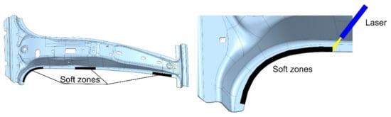 The soft zone can be also generated after process of the hot stamping. This method involves usage of laser beam source (Figure 10) or induction heating [33] to tempering and softening of some areas of the drawpiece. Split and moving laser beams, attached to the wrist of an industrial robot, heat-up narrow zones of the drawpiece, generating soft zones of required shape. This is a good method for obtaining the soft zones with small dimensions and complex shape.