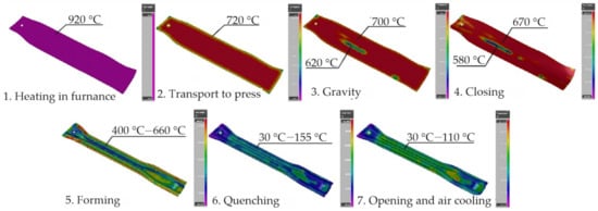 Computer simulations of the hot stamping process belong to coupled simulations from fields of mechanics, metallurgy, and heat exchange. The process of simulation is divided into a few stages (according to real run of the process): heating-up, transport to stamping die, gravitation, holding in the tool, stamping, quenching, opening of the tool together with cooling of the drawpiece in the air. Temperatures of the blank and the drawpiece at all simulation stages of the hot stamping are presented in Figure 11.