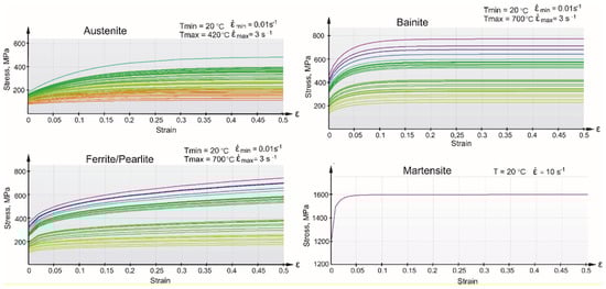 The strengthening curve is a function of temperature and strain rate. In the studies [34,35,36], experimental tests of the 22MnB5 steel at different temperatures and various strain rates are discussed in detail. A correct mathematical model requires generating numerous strengthening curves in a wide range of temperature and strain rate, which cover the whole possible processing window of the hot stamping. The temperature and strain rate dependent mathematical description was made. Figure 12 presents typical strengthening curves as a function of temperature and strain rate for the 22MnB5 steel [11]. The curves in the diagram are determined in the same temperature range (from 20 °C to 850 °C) and metallurgical phases (austenite, ferrite/pearlite, bainite, martensite), in which the hot stamping process is carried out. Each figure represents a wide range of tensile curves for the successive microstructures generated in a representative strain rate range and a temperature range.