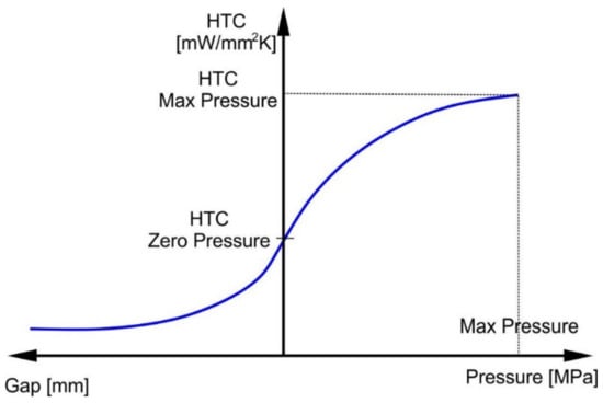 It is also very important to define suitable conditions for heat conduction between the blank and the tool (die, punch, and clamp) and surroundings. As evidenced in [30,42,43,44,45], the heat transfer coefficient (HTC) from the blank to the tool depends on a value of the pressure, which the tool puts against the blank (drawpiece), and on the size of the gap between them. This dependency is presented in Figure 13.