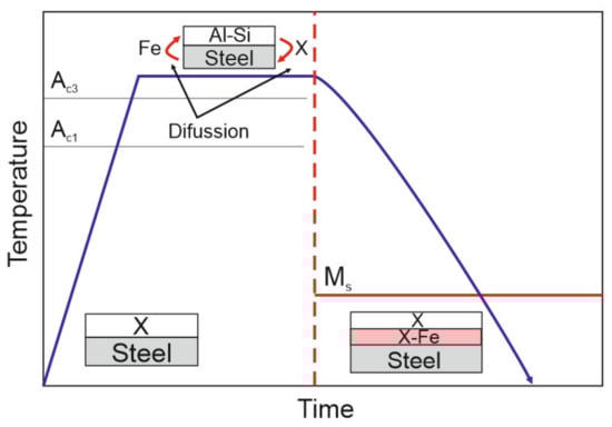 Diffusion changes taking place in the coating in the subsequent stages of the technological process of hot stamping of steel sheets; X—coating element.