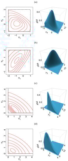 In Figure 1, we present contour plots and PDF plots of the truncated bivariate skew-normal distribution. Note that the contours are deformed ellipses in accordance with the parameter , and they are projected onto the supports of the distributions. As vary, the bivariate truncated skew-normal distribution takes different forms (Figure 1a–d). In Figure 1d, where , the contours are truncated ellipses corresponding to the truncated bivariate normal distribution.