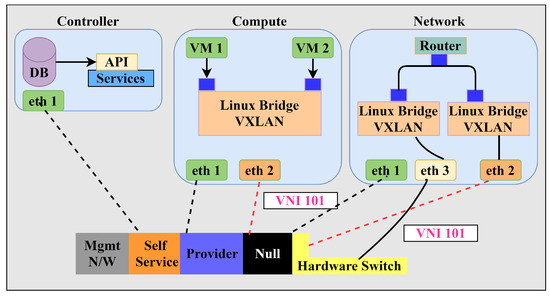 The OpenStack neutron API, a virtual Network Interface Card (NIC) for providing network as a service (i.e., between interface devices) uses three main networks, as mentioned in Figure 5. To start with the Management network, it takes care of managing communication between the nodes, and the communication happens via Ethernet. In contrast, the provider network takes care of external communication from the instance, and it uses a Linux bridge+VLAN mechanism and lastly self-service or VMnet, which take care of the tenant network by using Linux bridge+VXLAN. The Linux network consists of multiple VMs, and KVM is used as a hypervisor, and these VMs are connected via a Linux bridge with several switches such as firewall, VLAN, and VXLAN. VLAN is meant for a provider network that uses a public IP for communicating with the external sources. In contrast, VXLAN is intended for a self-service network that uses private IP for internal communications.