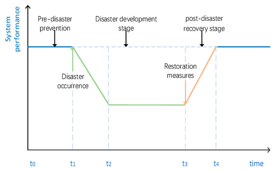 The destruction and impact of extreme disasters on the power grid are carried out in space-time [22,23]. To propose a resilience index that can accurately reflect the disaster response capability of the main power grid, we divide the recovery process of extreme disasters into three stages according to the time dimension. As shown in Figure 1, in the pre-disaster prevention stage t0~t1, the power grid can take some disaster prevention measures in the normal working stage, and the resilience index in this stage is mainly related to pre-prevention. In the disaster development stage t1~t3, extreme disasters cause continuous damage to the power grid, and the resilience index in this stage is mainly related to the severity of the loss caused by the disaster to the power grid. In the post-disaster recovery stage t3~t4, the power grid gradually recovers from the damage through adjustment, and the resilience index in this stage is mainly based on recovery efficiency [24].