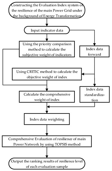 According to the evaluation index system of the main network resilience under the background of energy transformation, combined with the above evaluation methods, the evaluation process of the main network resilience is shown in Figure 2.