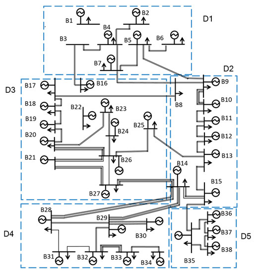 To verify that the evaluation index system and method proposed in this paper can effectively evaluate the resilience level of the main power grid in the context of the energy transition, we take the power grids of four areas in one region as the evaluation samples. The power grids of four areas in a region are taken as evaluation samples. This area is located in a coastal city, and its extreme disasters are mainly typhoons. Taking the typhoon disasters in this area as an example, we evaluated the area’s resilience level after external shocks. The regional grid transmission network is shown in Figure 3.