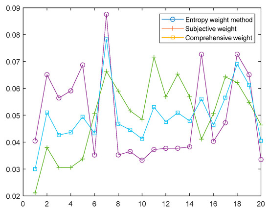To verify the scientificity and superiority of the comprehensive index weight modelling method based on the priority comparison method and CRITIC, we take the entropy weight method to calculate the index weight and compare it with the article method, as shown in Figure 4.