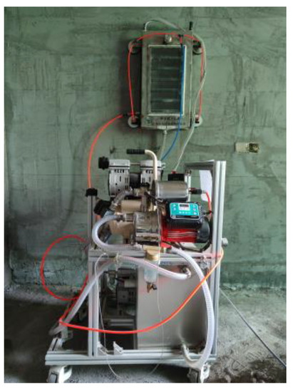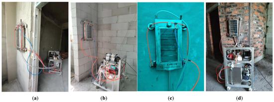 The water pressure system consists of a booster pump, a flow meter and a water pipe. The system’s main function is to adjust the water pressure, simulate the scour and penetration of the wall under different rainfall conditions and monitor the flow rate. The wind pressure system is mainly composed of small air compressors, pressure regulators, etc. Its main function is to simulate the impact of natural direct blowing on the penetration. In order to realize the gradient pressure adjustment of the wind pressure, a miniature pressure regulator is assembled with a pressure adjustment accuracy of 10 kPa. In addition, the right and left sides of the spray hood are symmetrically equipped with straight-through pneumatic connectors, and the interface can be selected for wind pressure loading according to the site detection conditions.