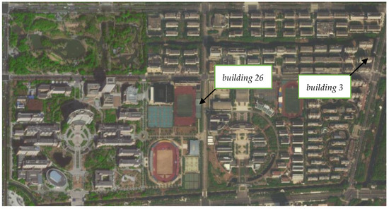 The NDT-WI-2 instrument is tested by conducting the on-site non-destructive measurement of wall impermeability to explore the influence of water pressure and wind pressure on wall permeability. The test sites are Building No. 3 and Building No. 26 of the Campus of Zhejiang Sci-Tech University, and the specific location is shown in Figure 7.