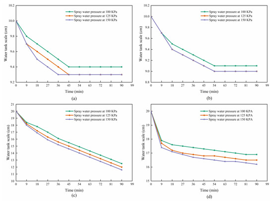 The results of the water seepage test are shown in Figure 9, in which the water loss curves of Figure 7b under the action of 125 kPa and 150 kPa spray water pressures overlap. It can be seen from the figure that, at the beginning of the test, the reading of the water tank drops rapidly. As the test progresses, the rate of decline gradually slows down and finally stabilizes. Through observation, it can be seen that the declining level of the water tank in the early stage is greater than that in the later stage, which may have a greater relationship with its surface painting. In the initial stage of spraying, the surface layer is in a dry state and moisture is quickly absorbed, and then it gradually penetrates into the interior under the action of its own gravity, capillary force, power, pressure difference and surface tension. In the case of only increasing the spray strength, the final penetration in similar walls is not much different, but the greater pressure of water confers it a stronger penetration ability in the early stage.