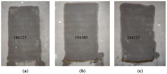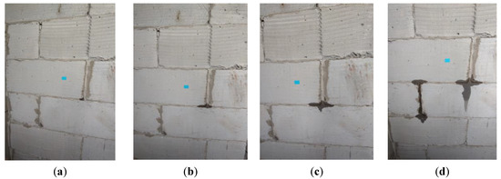 The test results indicated no leakage on the opposite side of the walls of Type I and III, while leakage occurred on the opposite side of the walls of Type II and IV. This shows that, after surface treatment, the impermeability of the masonry wall will be greatly improved. With the increase in sprayed water pressure, the initial seepage time of similar walls tends to be shortened. In addition, the initial seepage positions are all located at the mortar joints, which can reveal that the mortar joints are weak points of the wall’s impermeability, and the horizontal mortar joints on some walls are the first to leak. This may be because the medium is in the process of vertical mortar joints. Under the action of gravity, the transmission direction will migrate downwards, which will cause the transmission distance to become longer and affect the transmission time. However, there is masonry under the horizontal mortar joint, and the transmission direction is always vertical to the wall, hence leakage occurs more quickly. After comparison, it can be seen that the initial seepage time of the Type IV wall is less than that of the Type II wall. This phenomenon may be related to the size of the masonry. The masonry size of the Type IV wall is much smaller than that of the Type II wall, which means that it is in the same area, the number of mortar joints is larger and the increase in the number of mortar joints as the weak points of the wall’s impermeability will increase the probability of leakage.