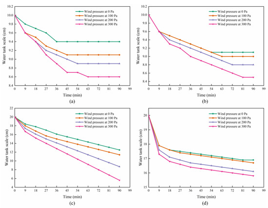 As can be seen from Figure 11, as the wind pressure increases, the final water seepage volume of the wall rises significantly. The wind pressure has a much greater impact on the water seepage volume than the water pressure. By comparing the slopes of the graphs, it can be concluded that, under the action of wind pressure, when the walls of Type II and IV reach a stable seepage state, their water seepage rate is significantly greater than that of the no-wind state, which means that the wind pressure plays a great driving force affecting the flow of water in the stable seepage channel.