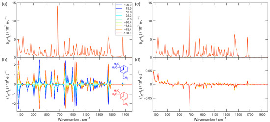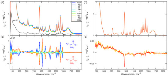 The Raman and ROA raw data used for the further analysis of α-pinene and alanine (nine enantiomeric mixtures) are presented in Figure 1a,b and Figure 2a,b. All spectra were then subjected to third-order five-point Savitzky–Golay smoothing. The spectral region 100–2000 cm−1 was used in all mentioned aspects of data processing. Figure 1c and Figure 2c show the Raman spectrum after baseline correction, and Figure 1d and Figure 2d show the spectrum of the ROA artifacts determined by Equations (11) and (12). The elevated Raman baseline was effectively corrected by the asymmetric least squares smoothing algorithm taken from [16]. The aim of this procedure was not to make the baseline as flat as possible but to unify Raman spectra in the data set before the ROA normalization.