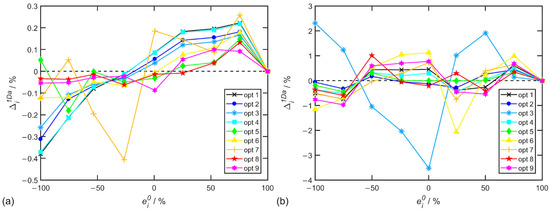 Another important set of parameters was the spectral range selection for Raman baseline correction, ROA normalization, artifact correction and EE determination. For the evaluations, we used the standard deviation of the EE determination errors after artifact correction again with the coefficient cB1, and the results are shown in Table 6 for α-pinene and in Table 7 for alanine. Individual EE determination errors for options in Table 6 and Table 7 are depicted in Figure 3.