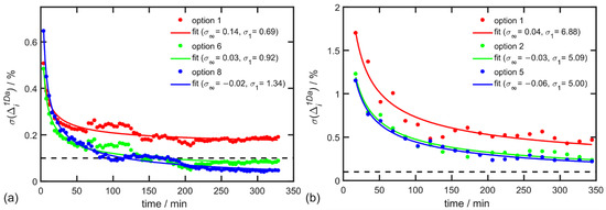 where is the standard deviation expected for the unit exposition time t and is the limit of the standard deviation for infinite time measurement, which can be interpreted as a residual systematic error.