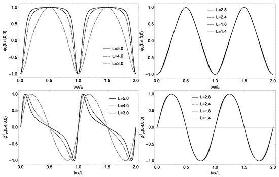 The field configurations and as a function of along the y = z = 0 line. The left panels correspond to and the right panels to . The half-skyrmion phase sets in when where L is the crystal lattice size inversely related to the baryon density of the matter. What is to be noticed is the (near) density independence of the configurations and which engenders what signals “scale invariance” in the half-skyrmion phase.