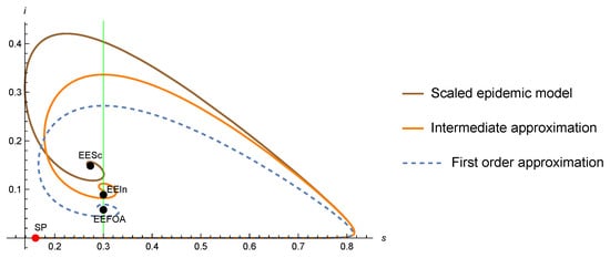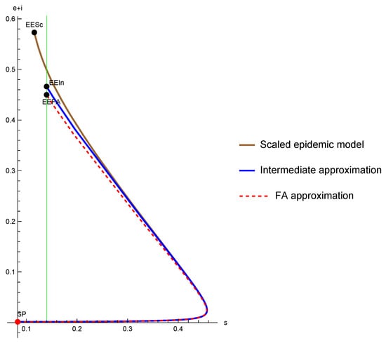 Parametric Plot of (s,e+i) of the SEIRS scaled model [17] “with slightly modified parameters” and its FA and intermediate approximations starting from a starting point SP=, with . EESc, EEIn, EEFA denote the intermediate points of the scaled model, interdemiate approximation, and FA approximation, respectively. The green vertical line denotes the immunity threshold .