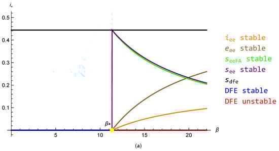 Bifurcation Diagrams with respect to . (a) Forward bifurcation diagram with respect to , DFE stable from 0 to where the coordinates of the endemic point are negative and the endemic point is stable after the critical bifurcation parameter , with , and . Bifurcation Diagrams with respect to . Here, , and . (b) Bifurcation Diagram with respect to , the endemic point is stable from 0 to and the DFE is stable when , with . The four points before the yellow one ensure the uniqueness of the endemic point when , see ([17], Theorem 3.3).