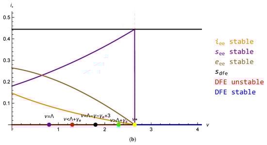 Eleven years later, the authors in [17] re-attacked the [14] problem with and vaccination (denoted by ). We note, by adding the two infection rates in ([17], Figure 1), which yields that the model depends only on , and so introducing two parameters for unnecessarily complicates the mathematics. Furthermore, the infection rate might as well be denoted by one parameter, and we chose the classical . Finally, one can relate their results to ours by substituting with and setting (i.e., giving up the second source of infections), and . Then, ([17], (8))