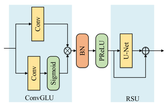 The GLU-RSU block consists of convolutional gated linear units (ConvGLUs) [32], batch normalization (BN), Parameter ReLU (PReLU), and a residual U-Net (RSU) [33], which is shown in Figure 2.