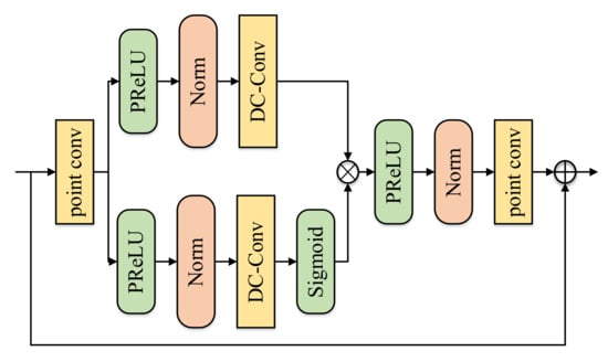 TCN is used to effectively capture the temporal dependence of speech. Compared with recurrent neural network (RNN), TCN is able to interfere in parallel and achieve better performance, by utilizing 1-D dilated convolutions. S-TCN is a lightweight TCN and consists of several squeezed temporal convolutional modules (S-TCM). From Figure 3, one can see that S-TCM includes the input point convolution, the gated depth-wise dilated convolution (GDD-Conv), and the output point convolution, where the input point convolution and the output point convolution are applied to squeeze and restore the feature dimension, respectively, and GDD-Conv has three differences with the depth-wise dilated convolution in traditional TCM. Firstly, the channel of the dilated causal convolution (DC-Conv) in GDD-Conv is less to effectively represent the information, due to the time-frequency sparseness of the speech spectrum. Moreover, GDD-Conv introduces a gating branch to facilitate information flow in the gradient back-propagation process. The gating branch utilizes the Sigmoid activation function, to map the output of DC-Conv to for changing the feature distribution of the main branch. Note that PReLU and normalization layers are inserted between adjacent convolutional layers, to facilitate the network convergence.