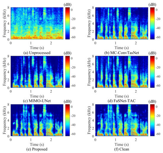 Spectrogram processed by different methods: Spectrogram of (a) a noisy reverberant mixture and enhanced signals processed by (b) MC-ConvTasNet, (c) MIMO-UNet, (d) FaSNet-TAC, and (e) the proposed system. (f) Spectrogram of clean speech.