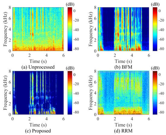 Besides, the proposed system with RRM achieves PESQ improvements of 0.13 and ESTOI improvements of 2.09%. Comparing the visualization results of the model with and without RRM from Figure 6, one can see that the residual noise components are further suppressed at low frequencies, and some missing speech components are recovered, which confirms the effectiveness of RRM in the proposed system.