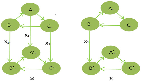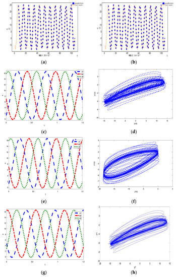Similarly, we provide two similar drive-response systems according to Equation (2) that have three signals input and one signal input. Then, we can attain two different response systems. We will use the double-layer coupled network model to simulate two drive-response systems (see Figure 1a,b). Equation (1) is regarded as the driven system, are the state variable of the oscillator of the driven system, are the state variable of the response system. Equation (3) represents the three signals driven-response system.