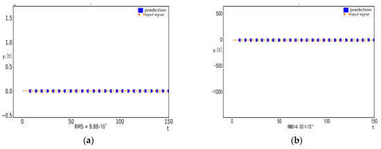 The trained reservoir system can infer the trajectory of the ring-coupled Lorenz oscillators system accurately. For the TSI, where we show the variable with a length of 100 as an example, see Figure 4a. Then we use the , and component of the ring coupled Lorenz oscillators system as the driving signal for which the input vector fed into the training reservoir computer becomes , where the initial values of are chosen randomly. Based on Equations (5) and (6), we can generate the subsequent values autonomously for which the output vector of the reservoir computer is used as the next input vector with the , and replaced by the driving signals , . For the OSI, where we show the variable with a length of 100 as an example, see Figure 4b. Then we use the component of the ring-coupled Lorenz oscillators system as the driving signal for which the input vector fed into the training reservoir computer becomes , where the initial values of are chosen randomly. Based on Equations (5) and (6), we can generate the subsequent values autonomously for which the output vector of the reservoir computer is used as the next input vector with replaced by the driving signal . Interestingly, we find the predicted trajectory obtained from TSI and OSI is consistent with the trajectory of the original system after . It shows that the TSI and OSI provided by the trained reservoir system will synchronize with a driving system provided by the coupled Lorenz system and correspond to the RMS are and respectively. The results of RMS clearly show that the reconstruction effect of OSI is better than TSI. The same procedure is followed in other experiments.