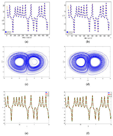 With the increase in , the ring coupled Lorenz oscillator system will transition to chaotic synchronization motion at 30.49. Setting , following the same procedure as CRW, in Figure 3a,b, we first choose the predicted value generated by TSI and OSI with a length of 500 to observe the reconstruction effect between the original system and the reconstructed system. We find that the predicted trajectory obtained from TSI and OSI is consistent with the trajectory of the original system after , and corresponding the RMS are and , respectively. The results of RMS clearly show that the reconstruction effect of OSI is better than TSI.