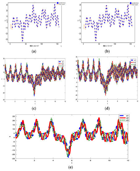 The periodic rotating wave motion occurs at 35.09. This state is characterized by a fast periodic motion of the oscillators of the array and phase differences of between adjacent oscillators. In Figure 5a,b, we show the variable with the length of 100 of the reconstructed and original systems to observe the reconstruction effect. Interestingly, if we set the system to evolve in a closed loop after , we find that the predicted trajectory obtained from TSI and OSI is consistent with the trajectory of the original system immediately. This shows that reconstruction of TSI and OSI and the ring-coupled Lorenz system can be achieved. Meanwhile, corresponding to the root mean square is and , respectively. The results of RMS more clearly show that the reconstruction effect of OSI is better than TSI.