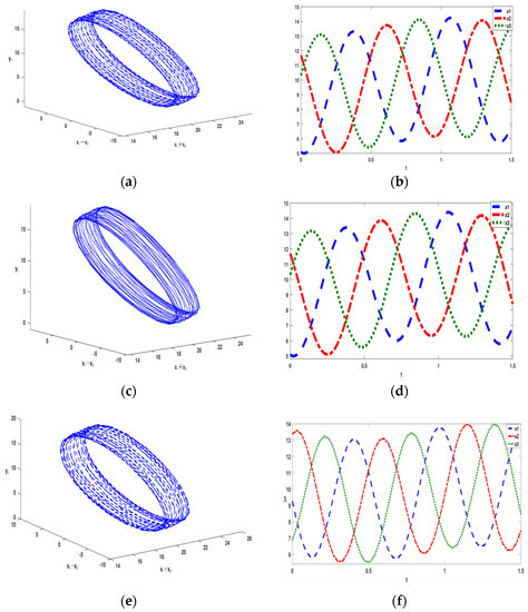 All the above matrices and identity matrix form a group . Moreover, all matrices and also satisfy the rotating periodic condition. Since the type of synchronous solution is only related to the difference of variable angle values in the eigenvalues of the matrices and the matrices , provide the same type of synchronous solution, we only need the matrices in the group Γ to attain all types of synchronous solutions [26]. What is more, all the rotating matrices corresponding to the same type of synchronous solutions are similar. Thus, we can obtain all types of synchronous solutions from the conjugate classes of the group . In fact, after diagonalizing , we find that has only two forms, which represent the complete synchronization of the oscillator and the synchronization with the same phase difference of , respectively. Since the system has multiple Hopf bifurcation points, it is possible for the system to produce invariant torus and even chaos [22,23,24]. Phase space reconstruction is a method of recovering and characterizing the original dynamic system from known time series. In short, it is a method of recovering the original system from time series; a typical method regards the system reconstructed in phase space as the synchronization system of the original system. In [31], Pecora and Carroll decided that combining two identical chaotic systems in a particular way was to take a signal from a component of the transmitter and send it to the receiver where the receiver was missing the part of the system. However, this missing part was retained by using the received signals. Thus, they demonstrated that by choosing the variable to drive the Lorenz system, then and subsystems will converge to and as the systems evolve together on identical trajectories. The system in [31] is expressed by Equation (2), and we can see it as the driven-response system as follows.
