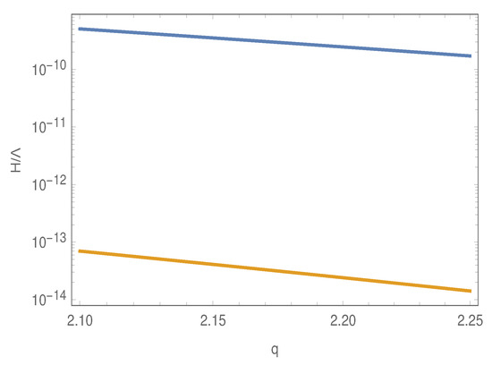 As we have mentioned earlier, the present magnetogenesis scenario predicts sufficient magnetic strength at the current universe when the parameter q lies within . With this information, we give the plots of with respect to q in the range (see Figure 1). The blue curve and yellow curve represent the respective at the beginning of inflation (when ) and at the end of inflation (when , with being the inflationary e-folding number), respectively. In the Figure 1, we take . Figure 1 clearly demonstrates that the ratio during the inflation remains less than unity for the aforementioned range of q, which also leads to the correct magnetic field over the large scale modes at the present epoch of the universe. The following points can be further argued from Figure 1: (a) at the end of inflation obtains a lower value compared to that at the beginning of inflation, and (b) the quantity seems to decrease as the value of q increases. The fact that remains less than unity, i.e., the relevant energy scale of the present model lies well below the cut-off scale, suggests the validity of the proposed theory as an effective field theory. Therefore, the regime of the parameter q, which makes the model viable in regard to the CMB observations of the current magnetic strength and also makes the relevant energy scale of the model below the cut-off scale, is given by .