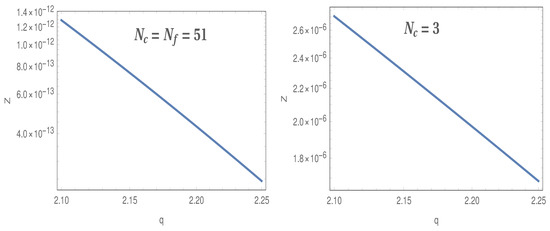 In order to investigate in the present context, we need to evaluate the integral of Equation (60). However, due to the aforementioned form of , this integral may not be obtained in a closed form, so we perform the integration by numerical analysis. This is depicted in Figure 4 where we take the following set of parameters: , , , and . In particular, we plot the ratio of with respect to the parameter q in Figure 4.