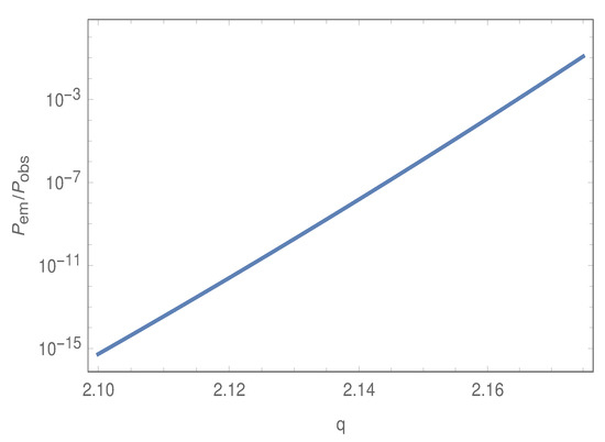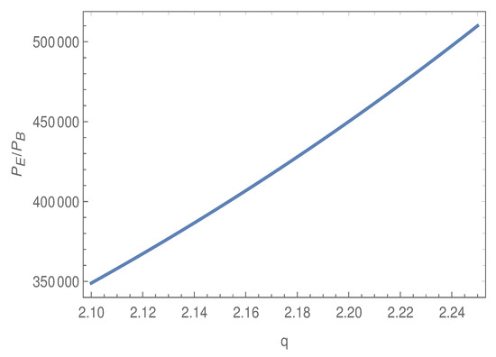 The EM energy density can be expressed by , where and are the energy density for electric and magnetic fields, respectively. However, from Equations (20) and (21), the ratio of the electric to magnetic power spectrum during inflation comes as . In particular, we give the plot of with respect to q in the range in which we are interested (see Figure 3).