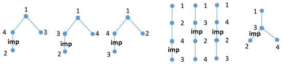 where is the set of labelled trees on with improper edges, and where is the number of children of the smallest node in the tree . We complement here the detailed definitions given in Section 2 of [] with an illustration for the case with . All trees are considered that have four labelled nodes and one improper edge. An edge is said to be proper if the minimal node of the subtree rooted in (including itself) has a value exceeding ; it is otherwise classified as improper. We find seven ways to achieve trees with four labelled nodes and one improper edge, as depicted in Figure 1. Node 1 has in three cases two children and in four cases only one. Equation (4) thus suggests that , agreeing with what may be read, e.g., in Table 2 of [].