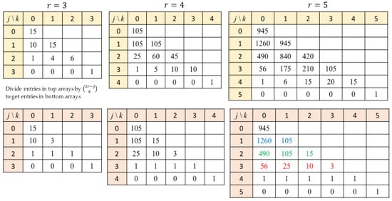 where . Expressing this in the form of Equation (7) while setting for , 1 and 2, is a straightforward algebraic exercise yielding , , , , , and . In line with this example, we constructed arrays of coefficients for and , as shown in Figure 2 (top arrays).